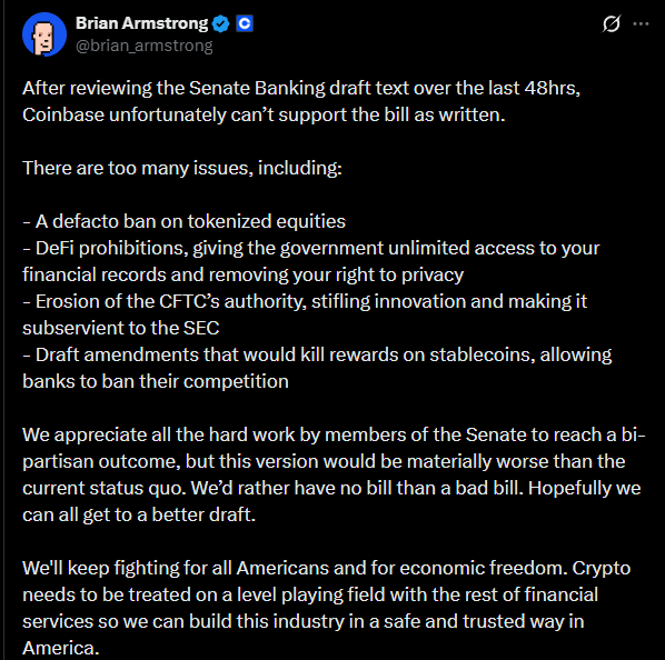 „Az elmúlt 48 órában átnéztük a szenátusi bankügyi tervezetet. Sajnos a Coinbase nem tudja támogatni a törvényjavaslatot ebben a formában” – mondta szerdán Brian Armstrong, a Coinbase vezérigazgatója.