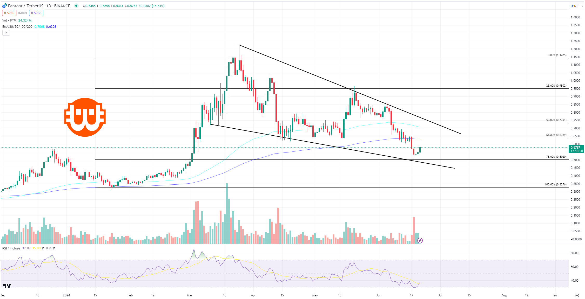 Az FTM árfolyama 0,5787 dolláron kereskedik, 6,01%-os napközbeni növekedéssel a tegnap esti sikertelen árfolyam-ugrás után, ami egy hosszú gyertyához vezetett.