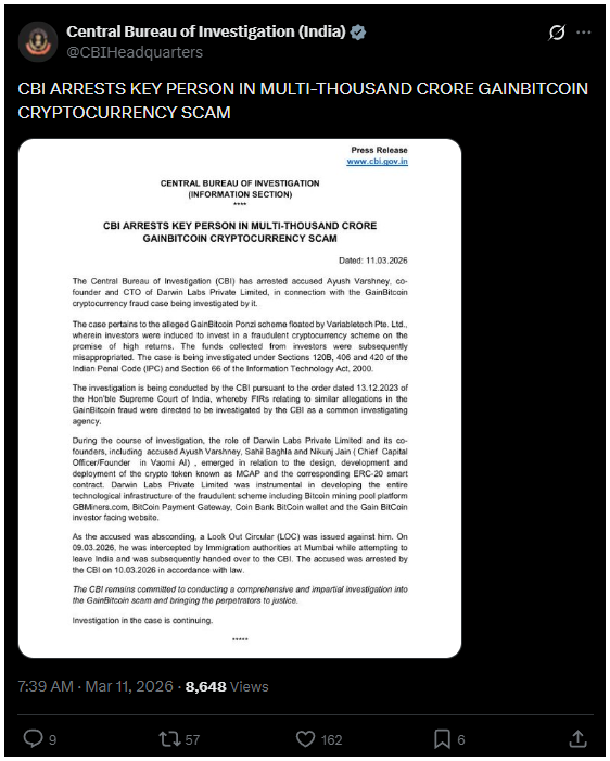 Az indiai Központi Nyomozó Iroda (CBI) letartóztatta Ayush Varshneyt, a Darwin Labs Private Limited társalapítóját és technológiai vezetőjét a GainBitcoin ügy kapcsán.