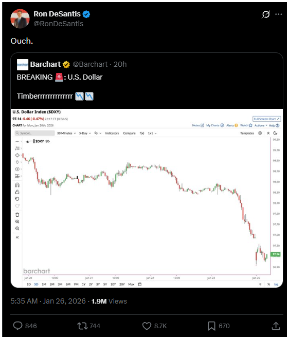 Ez több mint 15 százalékos visszaesést jelent a 2022-es csúcshoz képest, és a dollár leggyengébb teljesítménye 2017 óta.