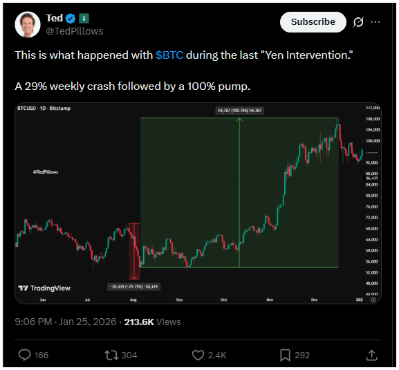 Korábbi jenpiaci beavatkozások idején a Bitcoin először jelentős volatilitást mutatott, volt példa heti közel 30 százalékos esésre is, ezt azonban gyakran egy gyors, akár 100 százalékos felpattanás követte.