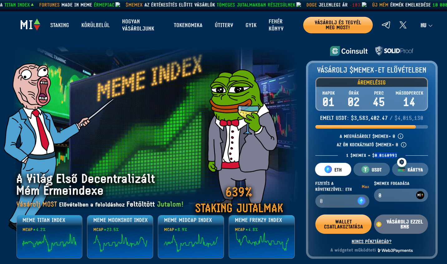 A $MEMEX előértékesítése már zajlik, és jelen pillanatban csak ezen lehet megvásárolni az érméket. Csak látogass el a Meme Index honlapjára, csatlakoztass egy pénztárcát (pl. Best Wallet), majd vegyél $MEMEX-et USDT, ETH, BNB vagy bankkártya segítségével.