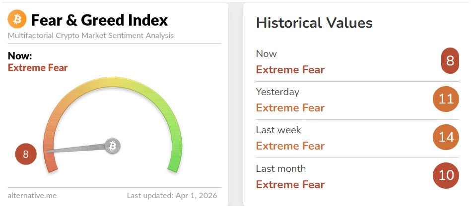 A befektetői hangulat sem segítette a fordulatot, mivel a Crypto Fear & Greed Index március nagy részében 20 alatt mozgott, ami extrém félelmet jelez.