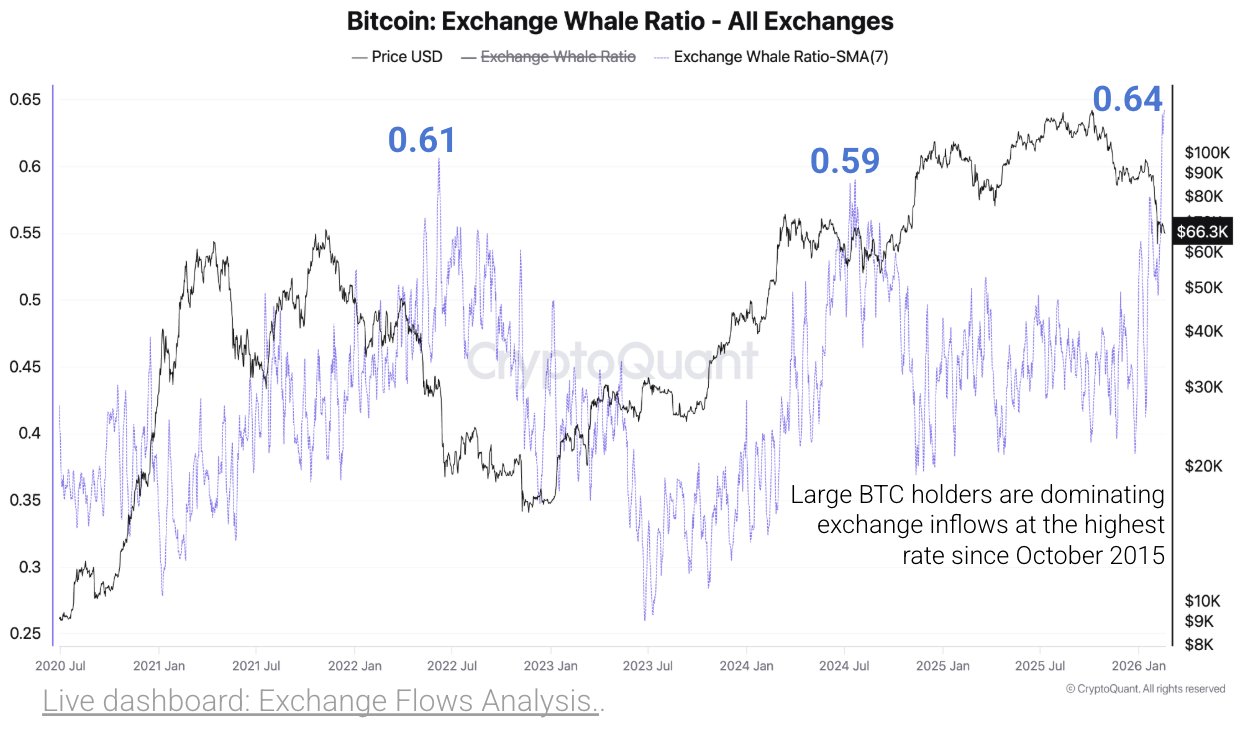 A CryptoQuant piaci jelentése szerint a BTC tőzsdei bálnaaránya 0,64-re emelkedett, ami 2015 óta a legmagasabb érték.