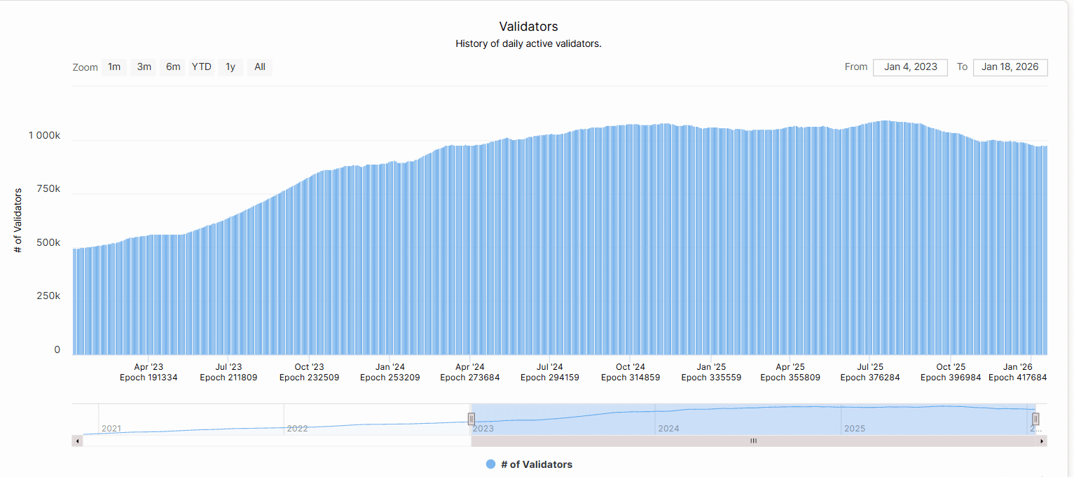 Az aktív validátorok száma nagyjából 977.000 és 1,04 millió között mozgott. Ez növekedésnek számít a 2023 végén mért körülbelül 890 000-hez képest.