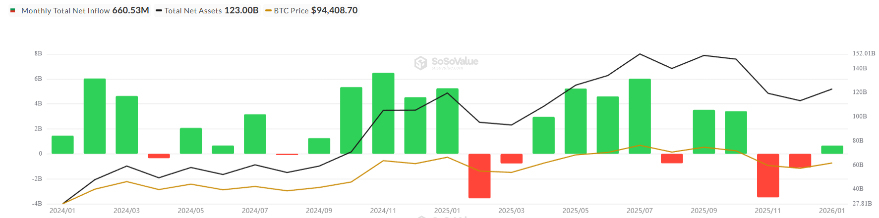 A bitcoin-ETF-ek eddig összesen 660 millió dollár nettó beáramlást értek el 2026-ban. A kereslet továbbra is ingadozik.