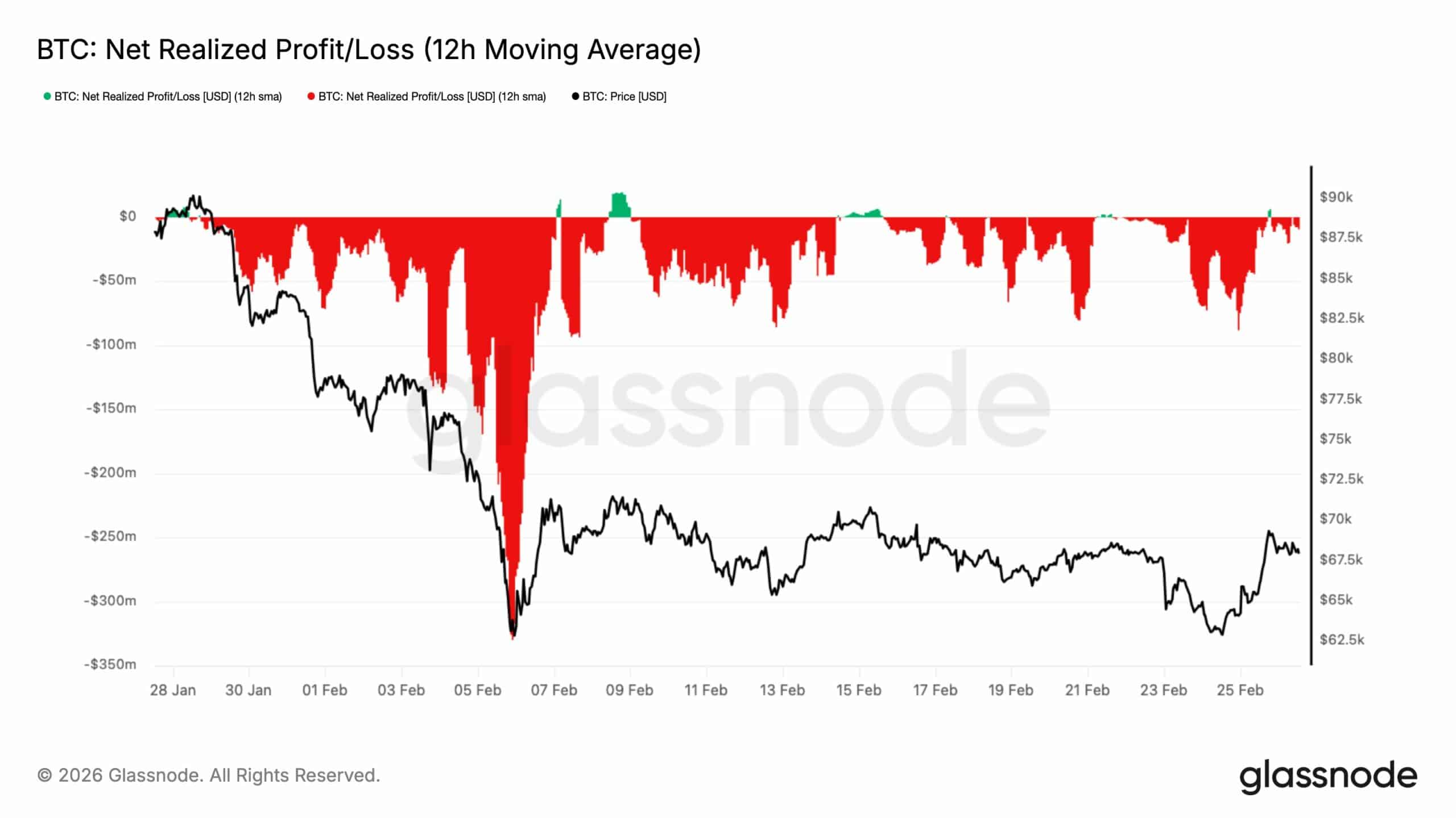 A bitcoin nettó realizált nyereség/veszteség aránya folyamatosan romlott, ahogy az árak gyengültek a január végi, közel 90.000 dolláros csúcs óta. A visszaesés során a realizált veszteségek a piacon tovább nőttek.