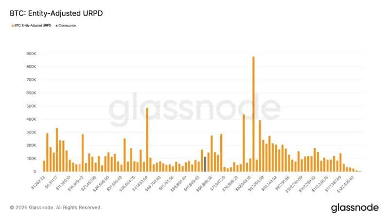 Az Entity-Adjusted URPD-adatok kiemelték, hogy a bitcoin felhalmozása sűrűn a 60.000–70.000 dolláros sávban összpontosul.