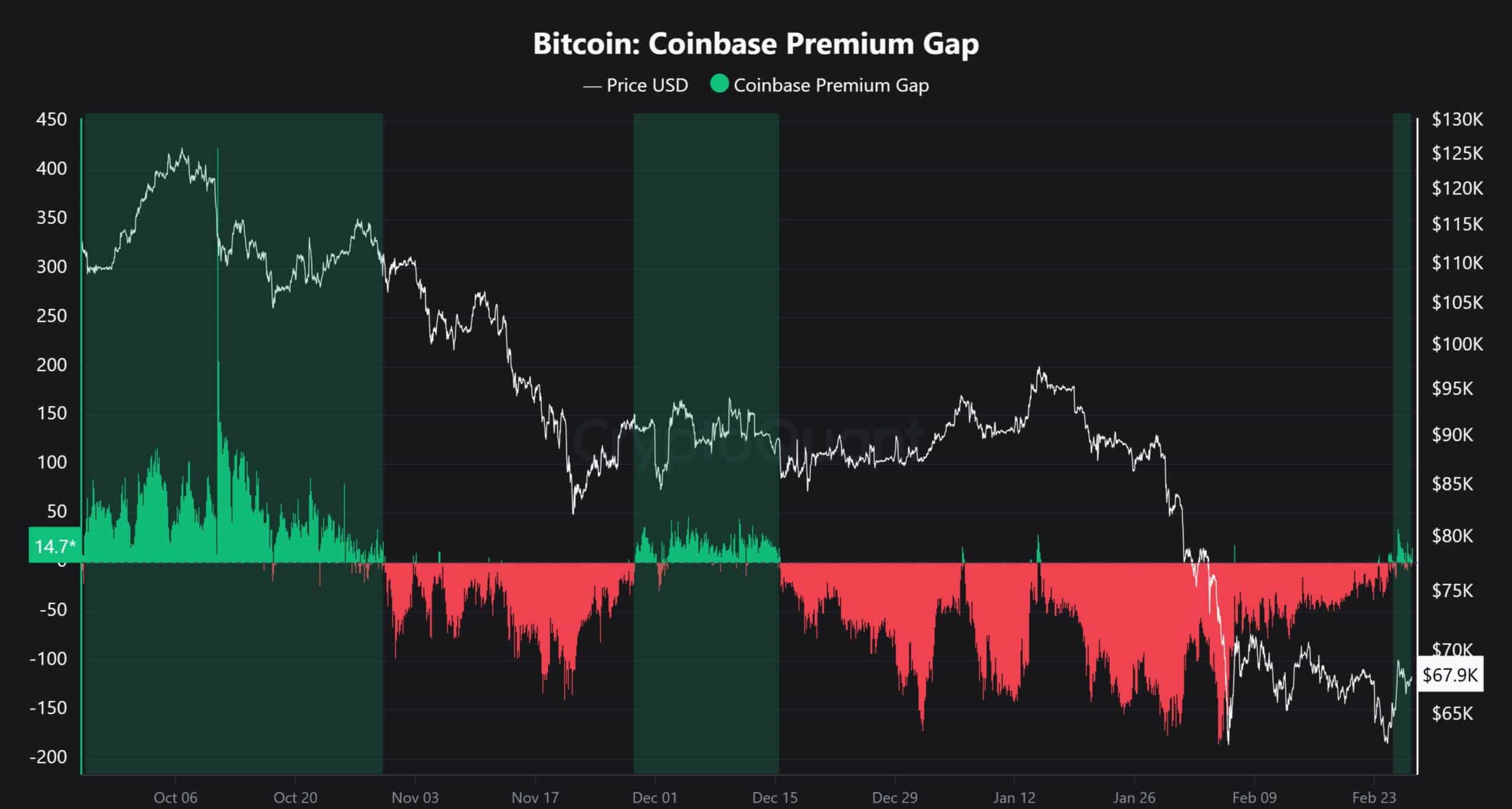 A Coinbase Premium Gap nemrég ismét pozitív lett, február 27-én +14,7%-ot ért el, közel négy hónapnyi negatív érték után.