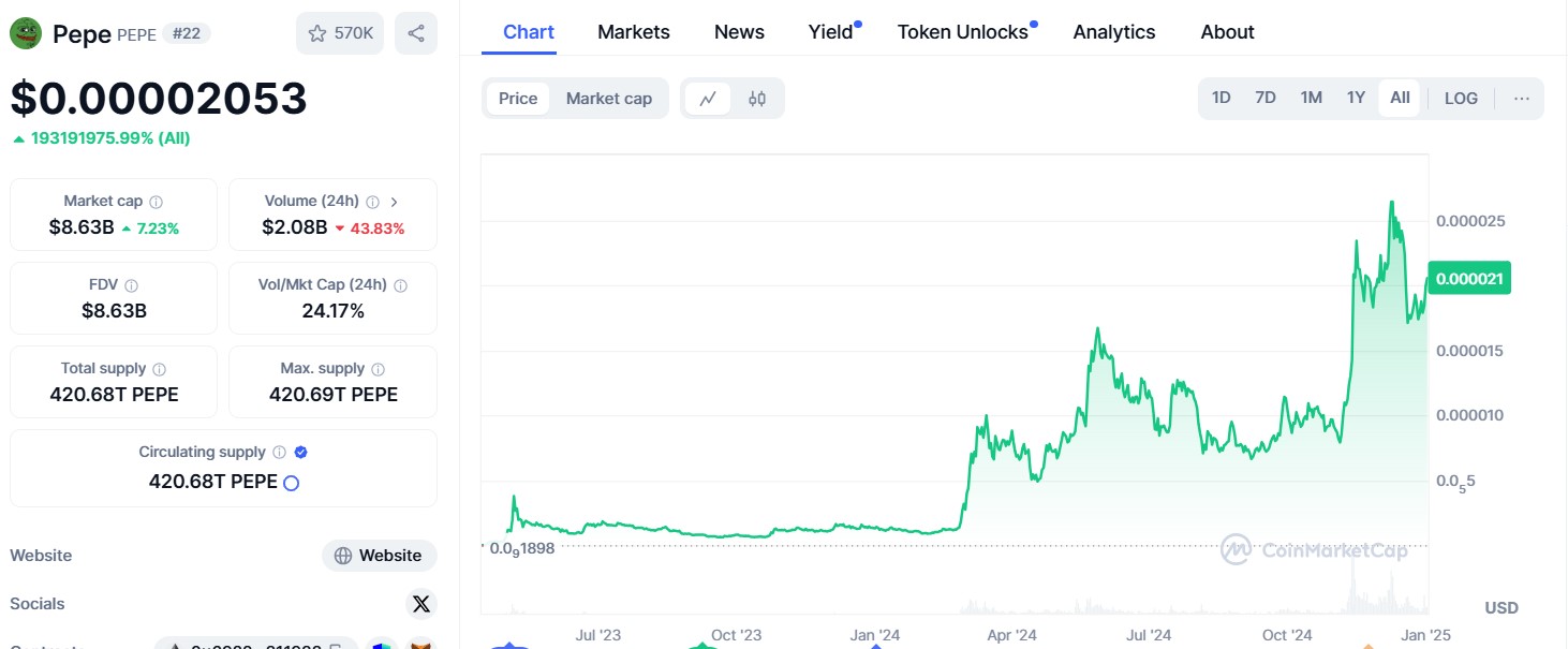 Mivel Elon Musk kitart a Pepe és a DOGE iránti rajongása mellett, a mém érmék békaszekciójában a lendület továbbra is szuper, (hiába korrigált a 2024-es év végén vadul több mém érme is).