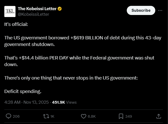 A 43 napos kormányzati leállás után 619 milliárd dollárral nőtt a hiány, Trump pedig újabb 2000 dolláros családi csekkeket dobott be az asztalra.