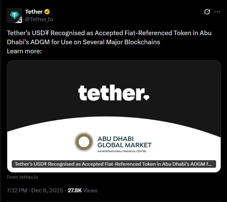 A Tether jelentős sikert ért el Abu-Dzabi ADGM területén. Az USDT-t most hivatalosan is elfogadott, fiat pénzhez kötött tokenként ismerték el több új blokkláncon, köztük az Aptoson, a Cosmoson, a Nearen, a Polkadoton és a TON-on.
