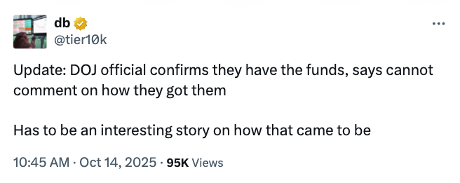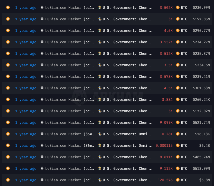 Az Arkham adatai szerint egy „LuBian.com Hacker” néven jelölt cím 120.576 BTC-t küldött – szinte a teljes vagyonát – egy „US Government: Chen Zhi Seized Funds” nevű címre, egyetlen tranzakcióban, 2024. július 5-én.