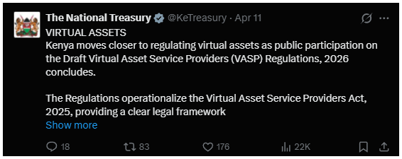 Kenya márciusban nyilvános egyeztetésre bocsátotta a VASP Regulations 2026 tervezetét, a Virtual Asset Service Providers Act 2025-re épülő végrehajtási rendelet utolsó, kötelező publikus egyeztetési szakaszát, amelynek határideje április 10. volt.