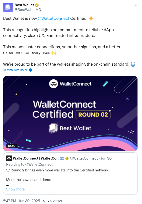 A biztonságra és a felhasználói élményre való fókusz miatt nem meglepő, hogy a Best Wallet 2025-ben hivatalos WalletConnect tanúsítványt kapott.