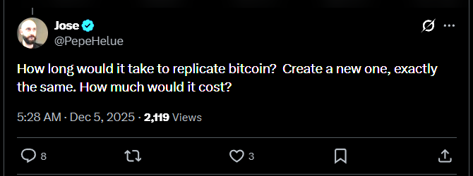 A megjegyzés így szólt: „Mennyi időbe telne lemásolni a bitcoint? Hozz létre egy újat, pontosan ugyanolyat. Mennyibe kerülne ez?”