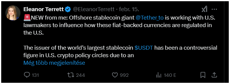 A vállalat szeretne hozzászólni két másik, törvényhozók által benyújtott szilme-törvényjavaslathoz is – mondta Paolo Ardoino, a Tether vezérigazgatója Terrettnek.