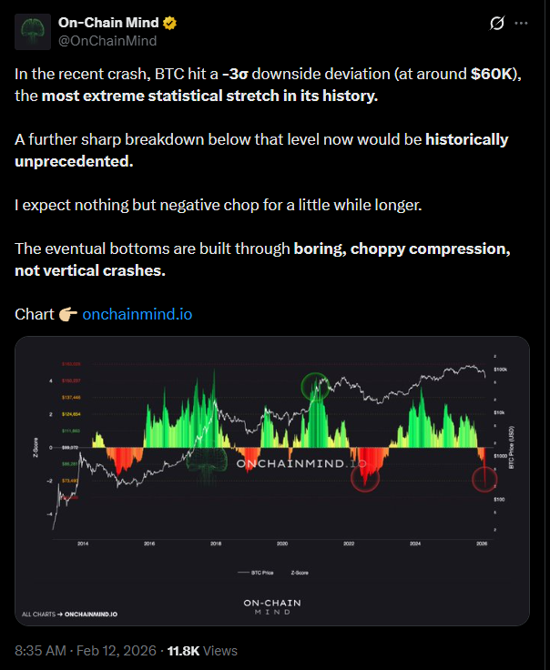 A Bitcoin Z-Score indikátor szerint a legutóbbi esés során a BTC elérte a -3 szórásos (−3σ) lefelé irányuló eltérést, amely nagyjából a 60.000 dolláros árszint környékére esik.