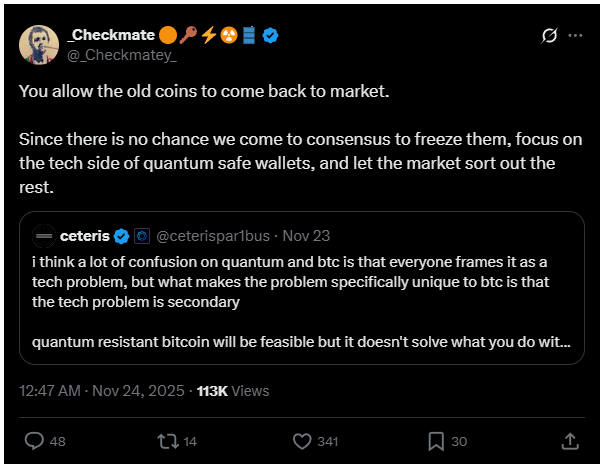 Egy hétfői X-bejegyzésben Check azt állította, hogy „nincs esély arra, hogy konszenzusra jussunk a bitcoin befagyasztásáról”, amelyet nem helyeztek kvantumálló címekre.