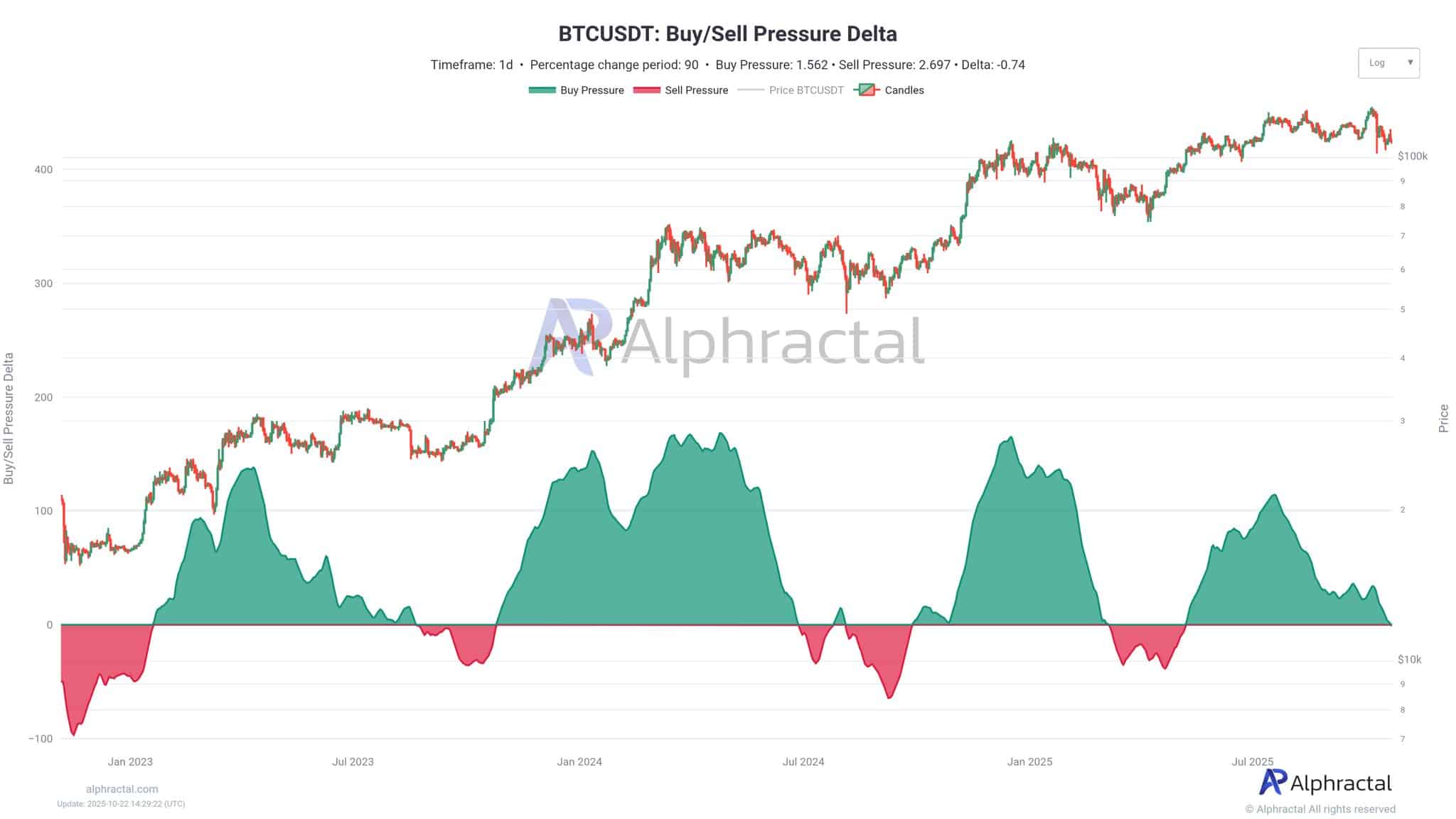 Egy másik adatsor, a Buy/Sell Pressure Delta, a legjobb beszállási és kiszállási pontokat jelző piaci szélsőségeket követi, és összhangban volt Thompson nézeteivel.