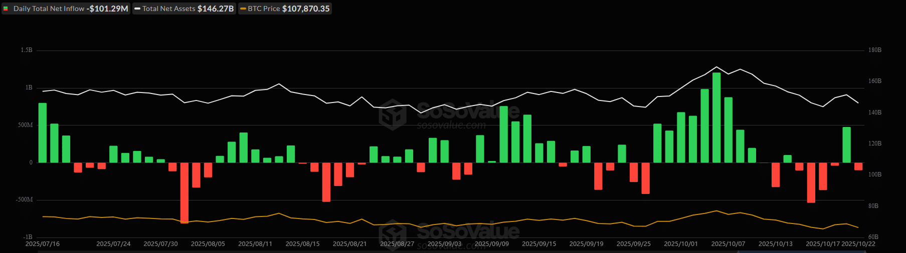 Október 22-én a spot BTC-ETF-ek 101 millió dolláros napi nettó kiáramlást mutattak. Október közepe óta az ETF-befektetők óvatosabbak, és inkább a tőke kiráamlása a jellemző.