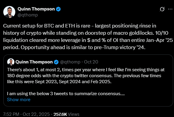 „A jelenlegi BTC- és ETH-helyzet ritka. A kriptotörténelem legnagyobb pozíciótisztítása zajlik, miközben kedvező makrogazdasági környezet közeleg. A lehetőség hasonló a Trump-győzelem előtti ’24-es időszakhoz.”