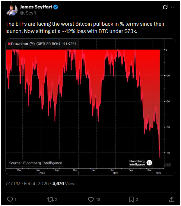 A Bitcoin árfolyama 73.000 dollár alatt jár, ami nagyjából 42%-os nem realizált veszteséget jelent az ETF-befektetők számára.