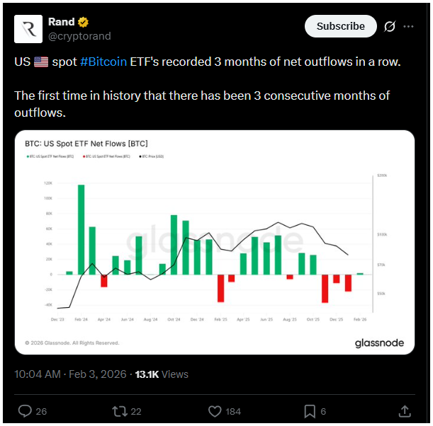A Rand elemzői szerint most először fordul elő, hogy három egymást követő hónapon át nettó tőkekiáramlás jellemzi a spot Bitcoin ETF-eket.