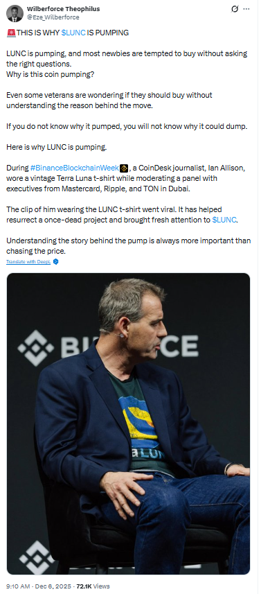 Mások pedig azt emelték ki, hogy a CoinDesk újságírója, Ian Allison egy dubai panelen moderátorként LUNC pólóban jelent meg a Mastercard, a Ripple és a TON képviselői mellett . Ez önmagában elég volt ahhoz, hogy a közösség újra rákapjon a „meme narratívára”.