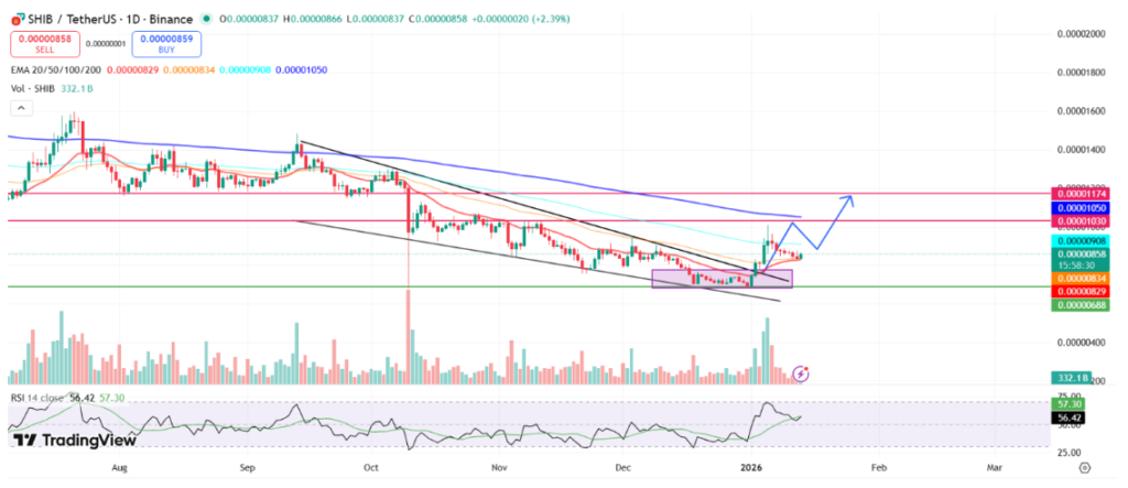 A Shiba Inu (SHIB) vegyes lendülettel indította 2026-ot. Bár az év elején egy mérsékelt felpattanás jelei mutatkoztak a hosszú konszolidáció után, az árfolyam nem tudta megtartani a nyereséget, és fokozatosan visszacsúszott a 0,000008300 dollár körüli kulcs-támasz közelébe, nagyjából a 20 napos EMA zónájába.