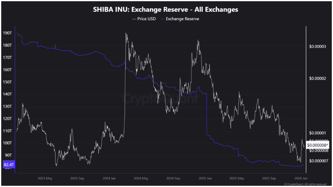 A Shiba Inu (SHIB) vegyes lendülettel indította 2026-ot. Bár az év elején egy mérsékelt felpattanás jelei mutatkoztak a hosszú konszolidáció után, az árfolyam nem tudta megtartani a nyereséget, és fokozatosan visszacsúszott a 0,000008300 dollár körüli kulcs-támasz közelébe, nagyjából a 20 napos EMA zónájába.