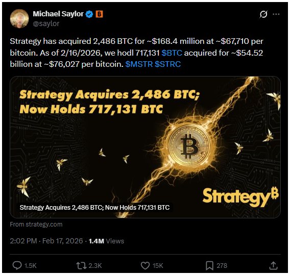 A Strategy társalapítója, Michael Saylor bejelentette, hogy a vállalat 2486 Bitcoint vásárolt mintegy 170 millió dollárért, 67.710 dolláros átlagáron.