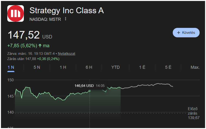 A Strategy részvénye, az MSTR, nemrég körülbelül 147 dollár körül mozgott, ami azt jelzi, hogy a befektetők továbbra is bíznak a Bitcoin-központú stratégiában.