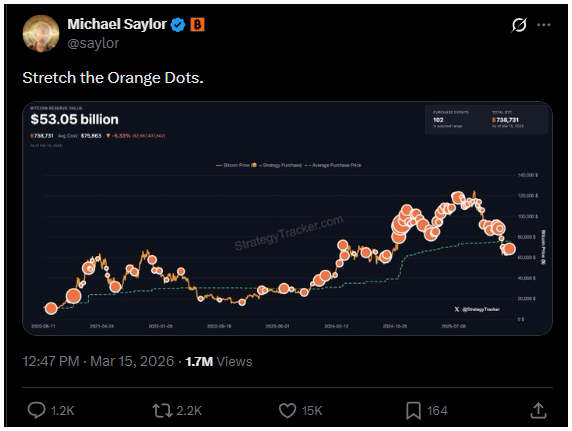 Saylor üzenete szerint a vállalat a jövőben is folytathatja a vásárlásokat, ami újabb „narancssárga pontokat” jelenthet a grafikonon.