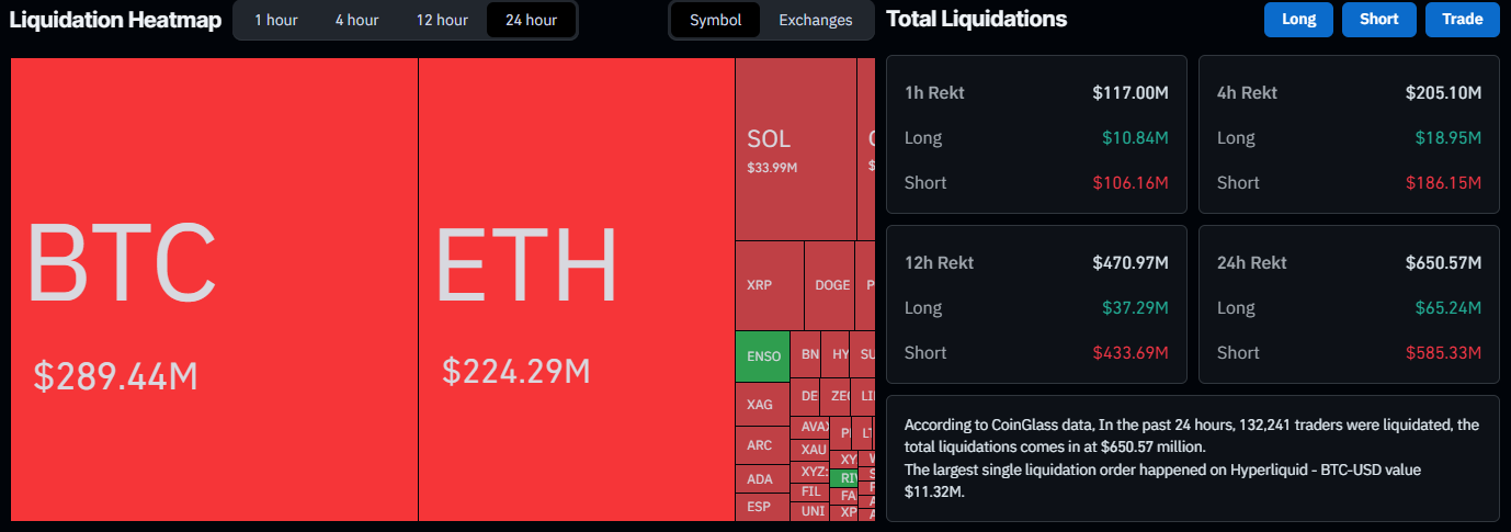 A CoinGlass adatai szerint egyetlen nap alatt több mint 580 millió dollárnyi short pozíció likvidálódott, ami tovább gyorsította az emelkedést.