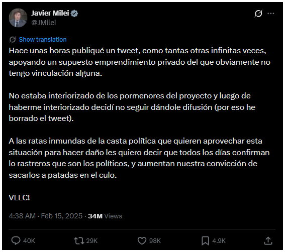 Mindez különösen azért fontos, mert Milei korábban azt állította, semmilyen köze nem volt a projekthez.