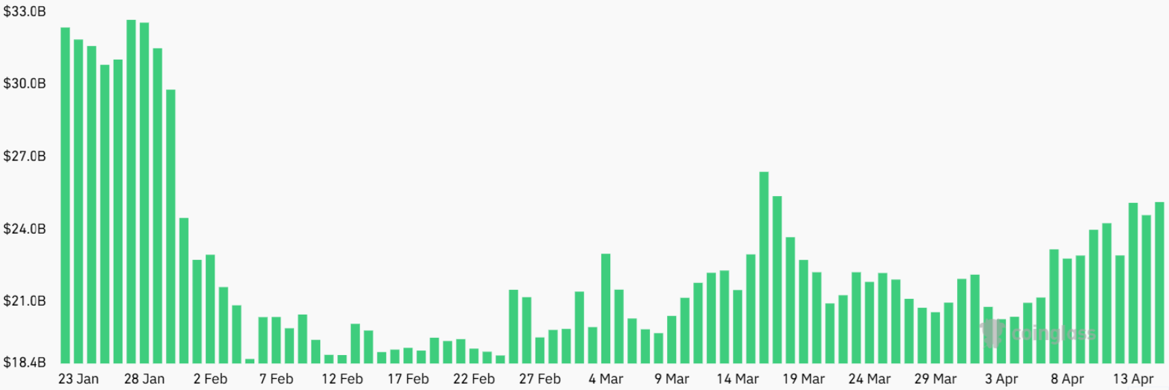 Az ETH határidős open interest-je 26%-kal nőtt, 25,4 milliárd dollárra emelkedve, miközben az ether árfolyama visszakúszott 2300 dollár fölé a március végi 1940 dolláros mélypont után.
