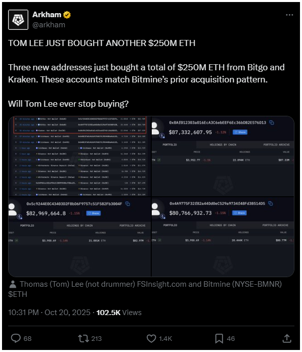 A hangulatot tovább erősíti, hogy Bitmine-hez köthető tárcák 250 millió dollár értékben vásároltak ETH-t, ami azt sugallja, hogy a nagy szereplők újra pozíciót építenek.