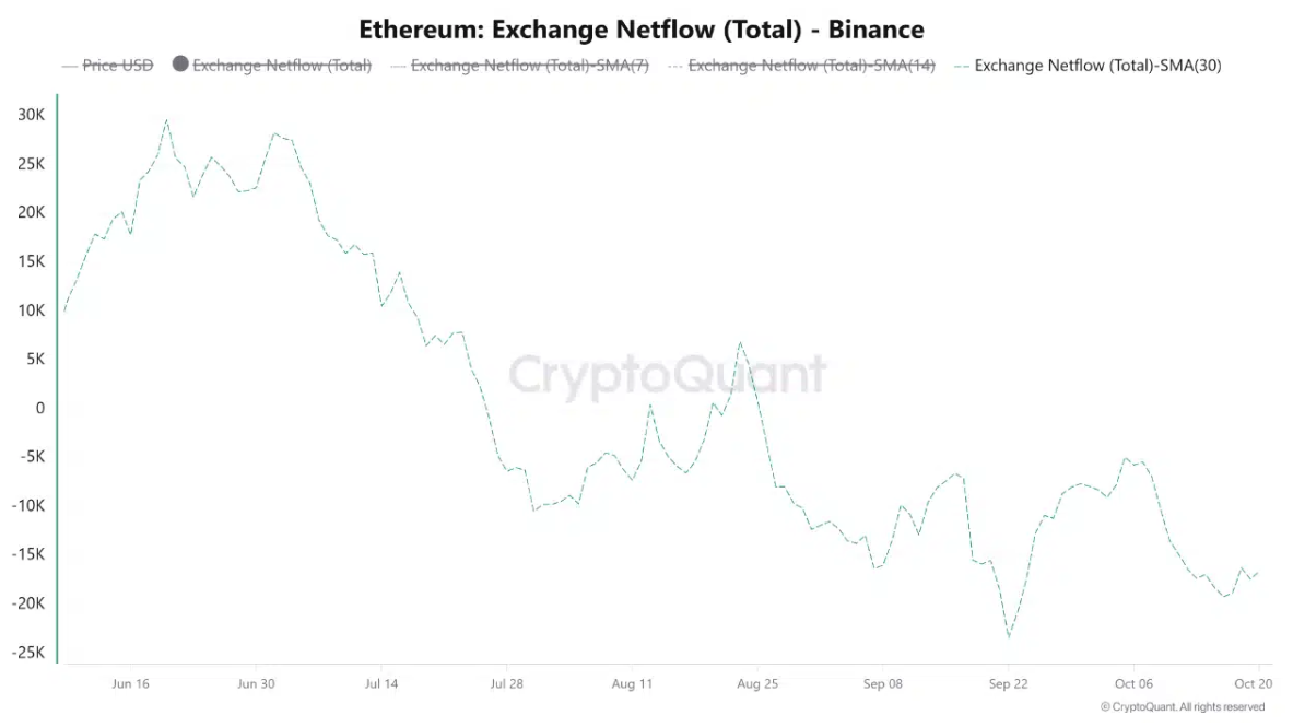 A Binance legfrissebb adatai szerint az eddigi erős beáramlás (inflow) most átfordult kiáramlásba (outflow) – vagyis több ETH távozik a tőzsdéről, mint amennyi beérkezik.