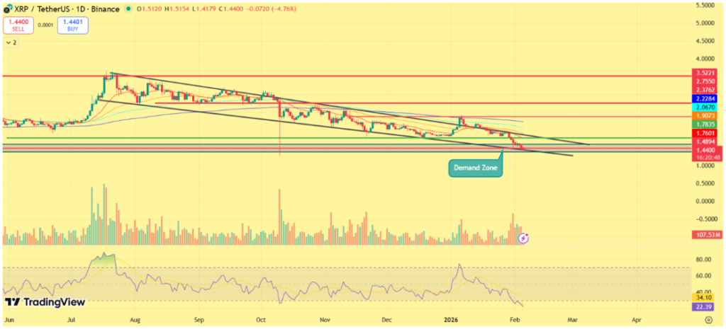 Jelenleg az XRP egy magas konfluenciájú keresleti zónába, 1,40 dollár környékére érkezett. Történelmileg ez a terület gyakran hozott rövid távú stabilizációt.