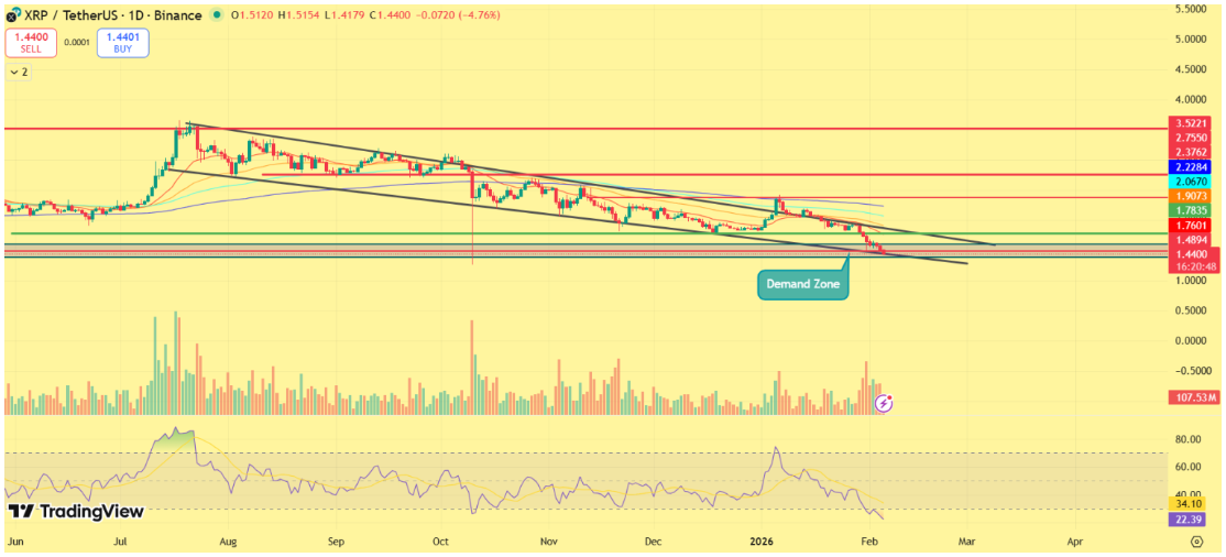 Jelenleg az XRP egy magas konfluenciájú keresleti zónába, 1,40 dollár környékére érkezett. Történelmileg ez a terület gyakran hozott rövid távú stabilizációt.