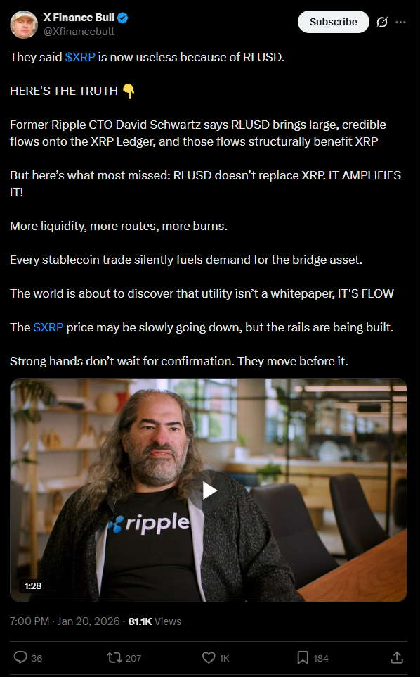 XFinanceBull szerint Schwartz kijelentette, hogy az RLUSD nagy, megbízható tőkét vonz a XRP Ledgerre (XRPL). Ez a tőke szerkezeti előnyöket biztosít az XRP számára.