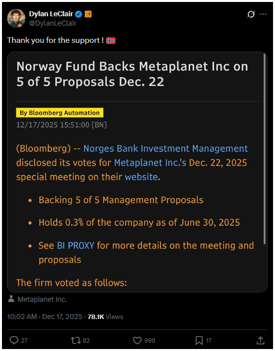 A december 22-i rendkívüli közgyűlés előtt az NBIM, amely nagyjából 0,3%-os részesedéssel rendelkezik a Metaplanetben, nyilvánosan jelezte: minden egyes vezetői javaslatot támogat.