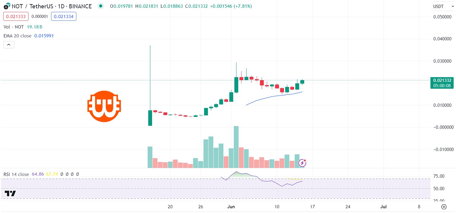 A Relative Strength Index (RSI) 64-es értéken áll, ami arra utal, hogy a Notcoin nem túlvásárolt és nem is túladott.