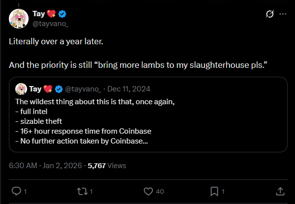 „Brian még mindig nem tartja fontosnak a felhasználók biztonságát a Coinbase-nél. Ez 2025-ben több mint 350 millió dollárjukba került. Meg lehetett volna előzni.”