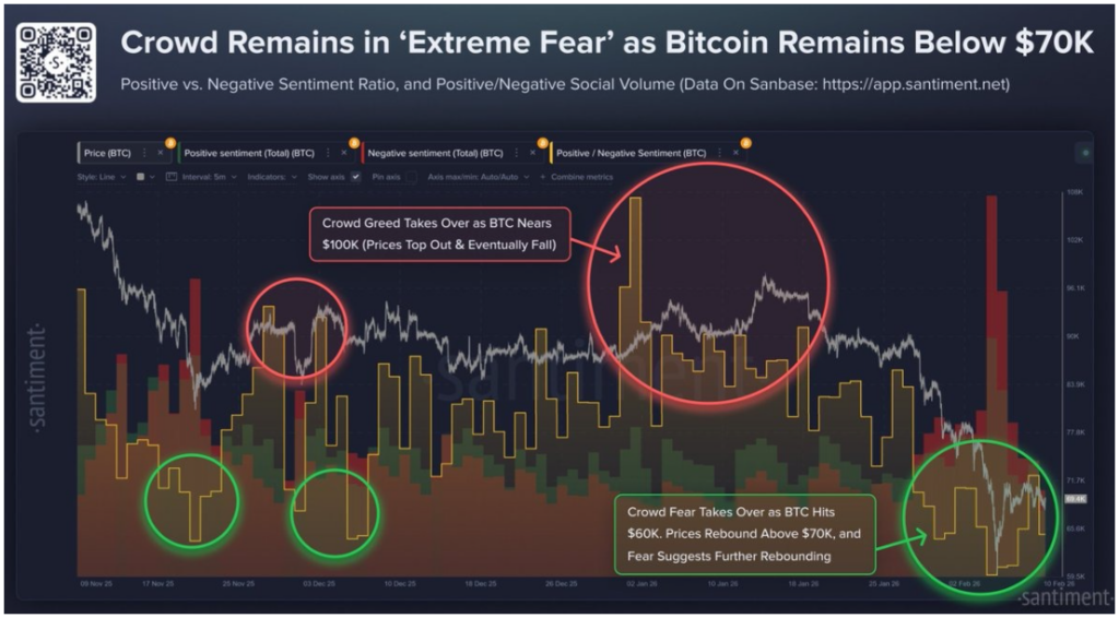 A Santiment szerint a „tömeg” hangulata ismét az „extrém félelem” zónájába csúszott, még akkor is, amikor az árfolyam stabilizálódott a 60.000 dollár alatti mélypont után.
