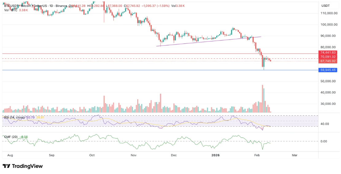 A rövid távú bullish kontroll visszaszerzéséhez viszont egyértelmű és tartós zárásra lenne szükség a 70.000 dolláros szint felett.