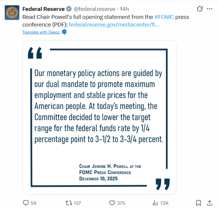 Az irányadó ráta 0,25 százalékponttal mérséklődött, így 3,65%-ra esett vissza. Ez volt az idei harmadik kamatvágás, amelyet a FOMC tagjai 9–3 arányban szavaztak meg.