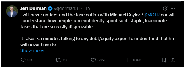 Szerinte elég öt percet beszélni bármely adósság- vagy részvényszakértővel ahhoz, hogy világos legyen: Saylor csak akkor kényszerülne Bitcoin-eladásra, ha a BTC addigra már olyan mélyre zuhanna, hogy annak eladása semmit nem változtatna a helyzetén.