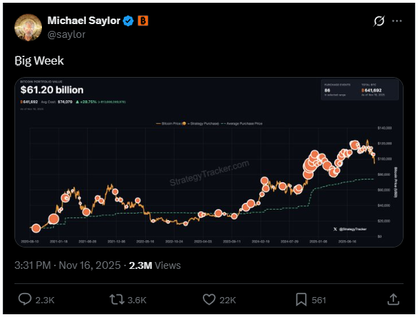 Azt írta, hogy „nagy hét” jön a cég számára, amit sokan egy újabb nagyobb BTC-vásárlás előjelének tartanak.